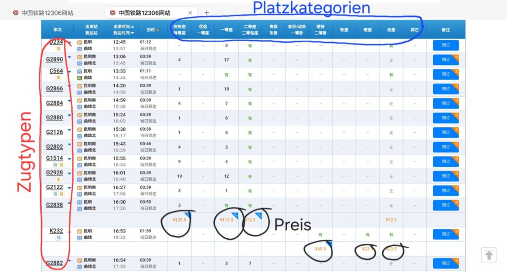 Wer also ein Bahnticket für die chinesische Eisenbahn erwerben möchte, sollte nun alles Wissen über Zugtypen und Platzkategorien kombinieren. Hier ein Beispiel für die Verbindung Kunming – Qujing, aufgenommen von der Website der chinesischen Eisenbahn: